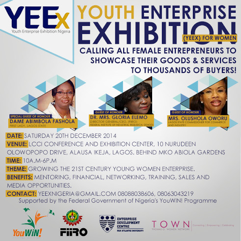 Youth Enterprise Exhibition (YEEx) Nigeria with the support of Federal Government of Nigeria’s YouWin Programme, Enterprise Development Center of Pan Atlantic University, Federal Institute of Industrial Research, Oshodi (FIIRO) is organizing another edition of Youth Enterprise Exhibition (YEEx) Nigeria this December. This edition, tagged “YEEx For Women” is for female entrepreneurs who are either just starting out or have been running their businesses for a while.